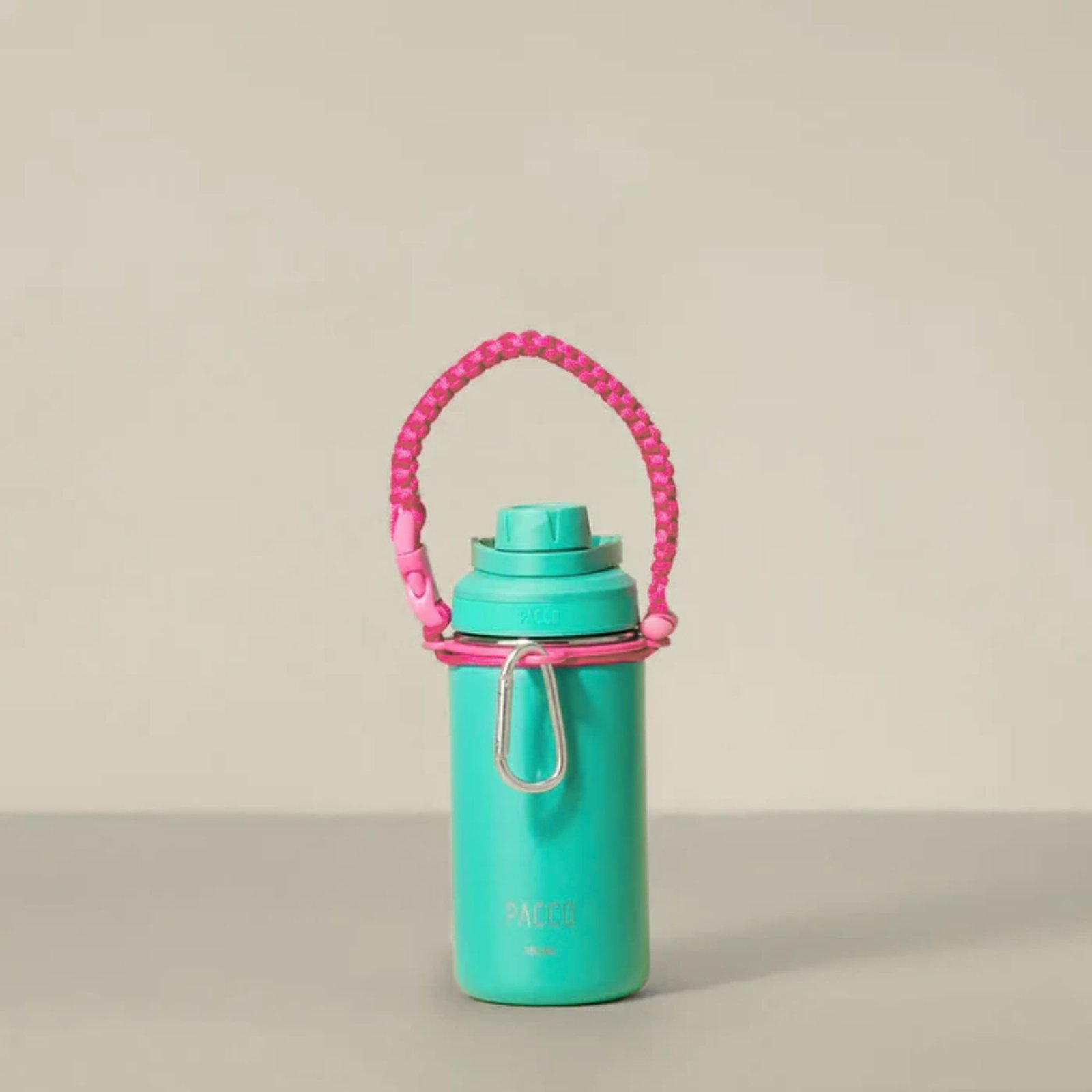 Ela vem equipada com um mosquetão robusto, facilitando o transporte da garrafa ao pendurá-la em alças, bolsas e mochilas. Ideal para quem busca praticidade e segurança no transporte de suas bebidas.