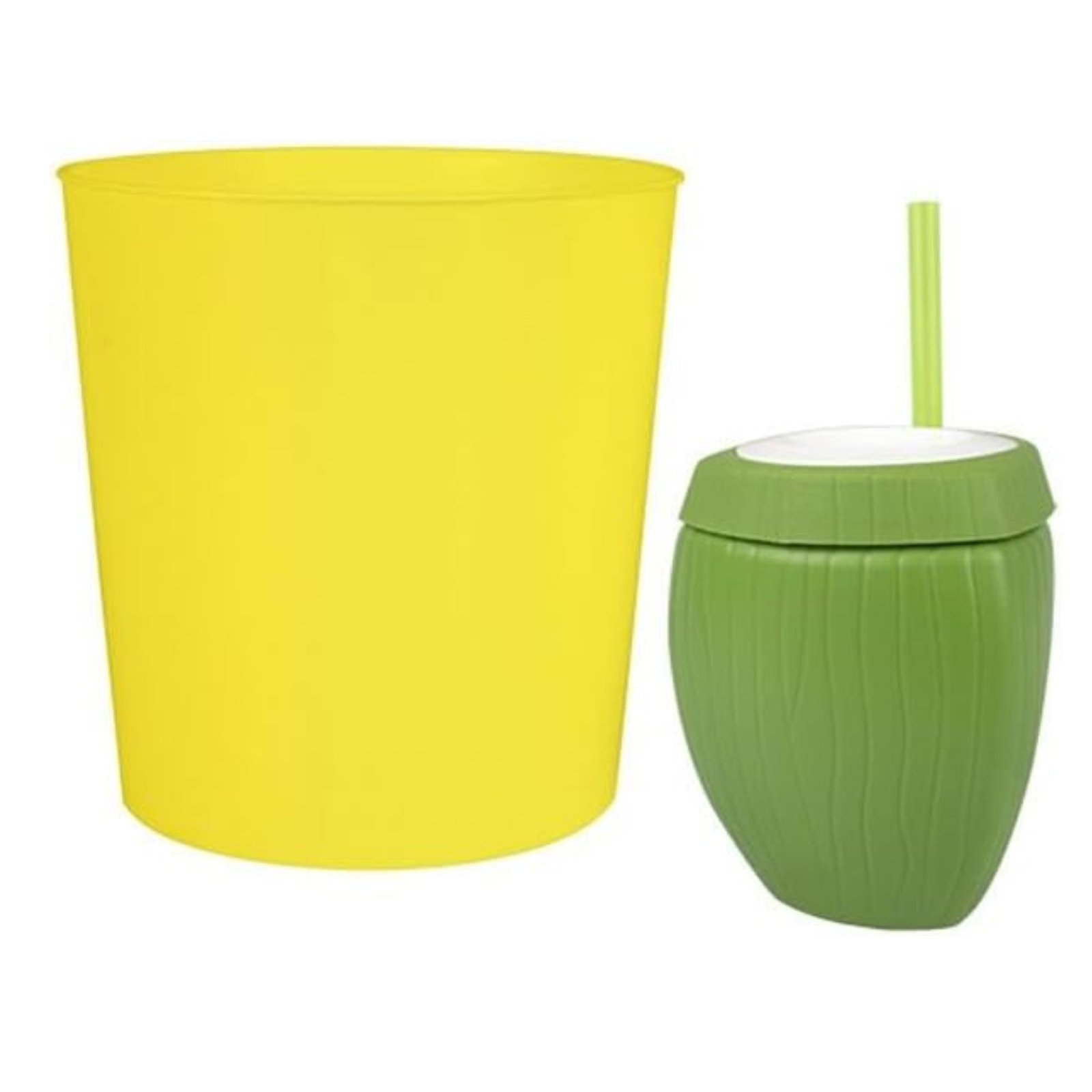 contém: 1 copo formato coco verde 0,85l e 1 balde amarelo com capacidade de 2,5l.