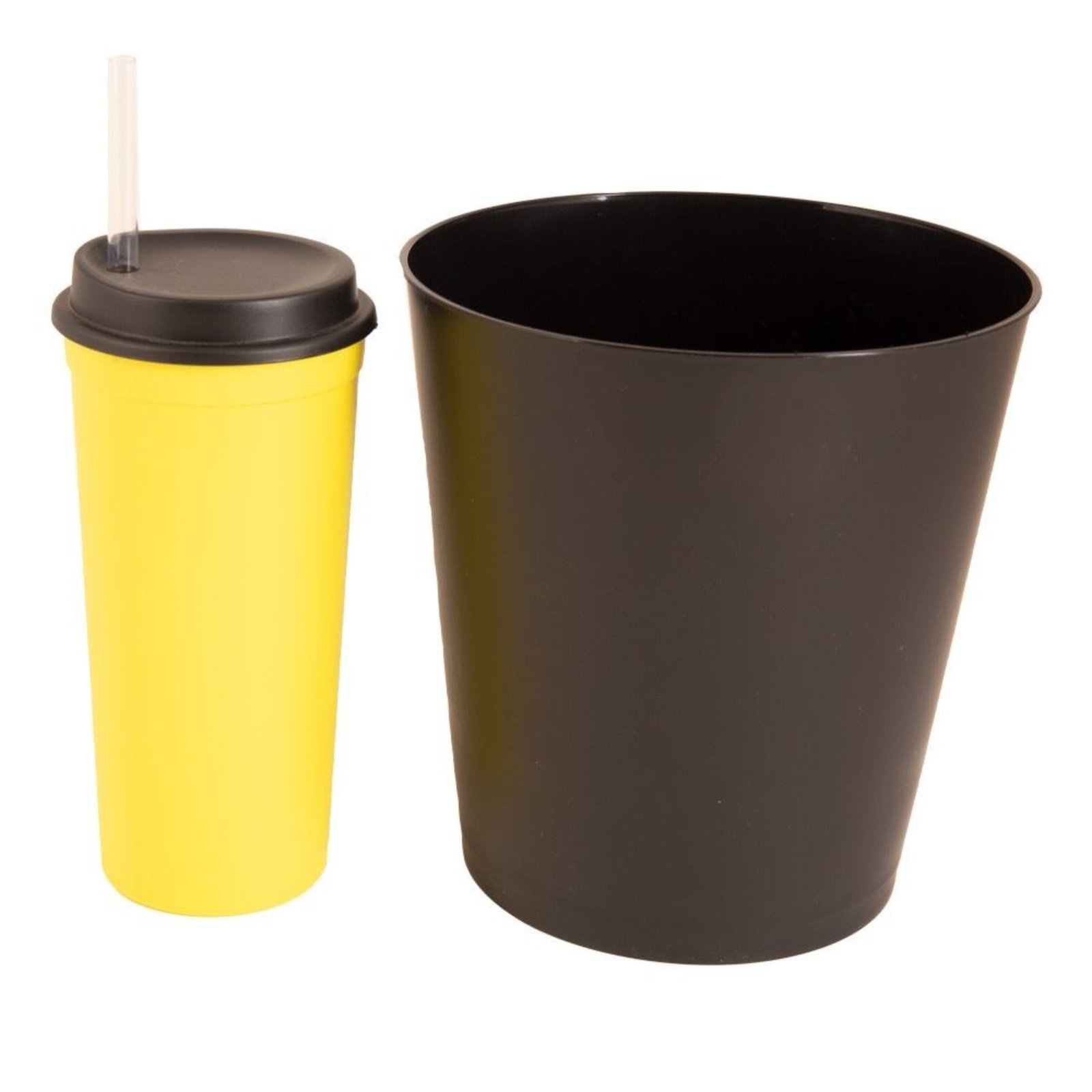 Contém: 1 Almofada porta pipoca com tampo em formato circular. 1 balde de 3l e 1 copo com tampa e canudo