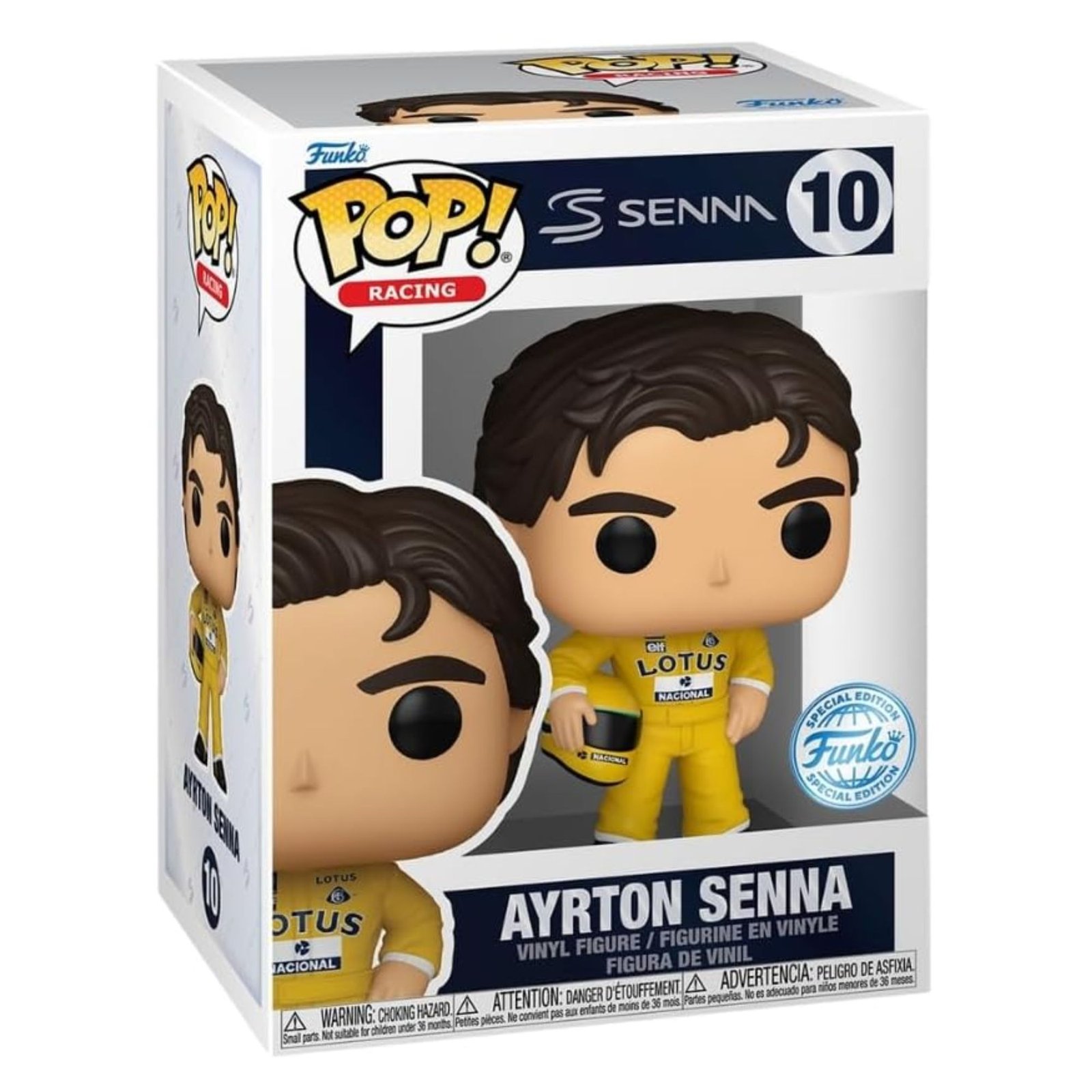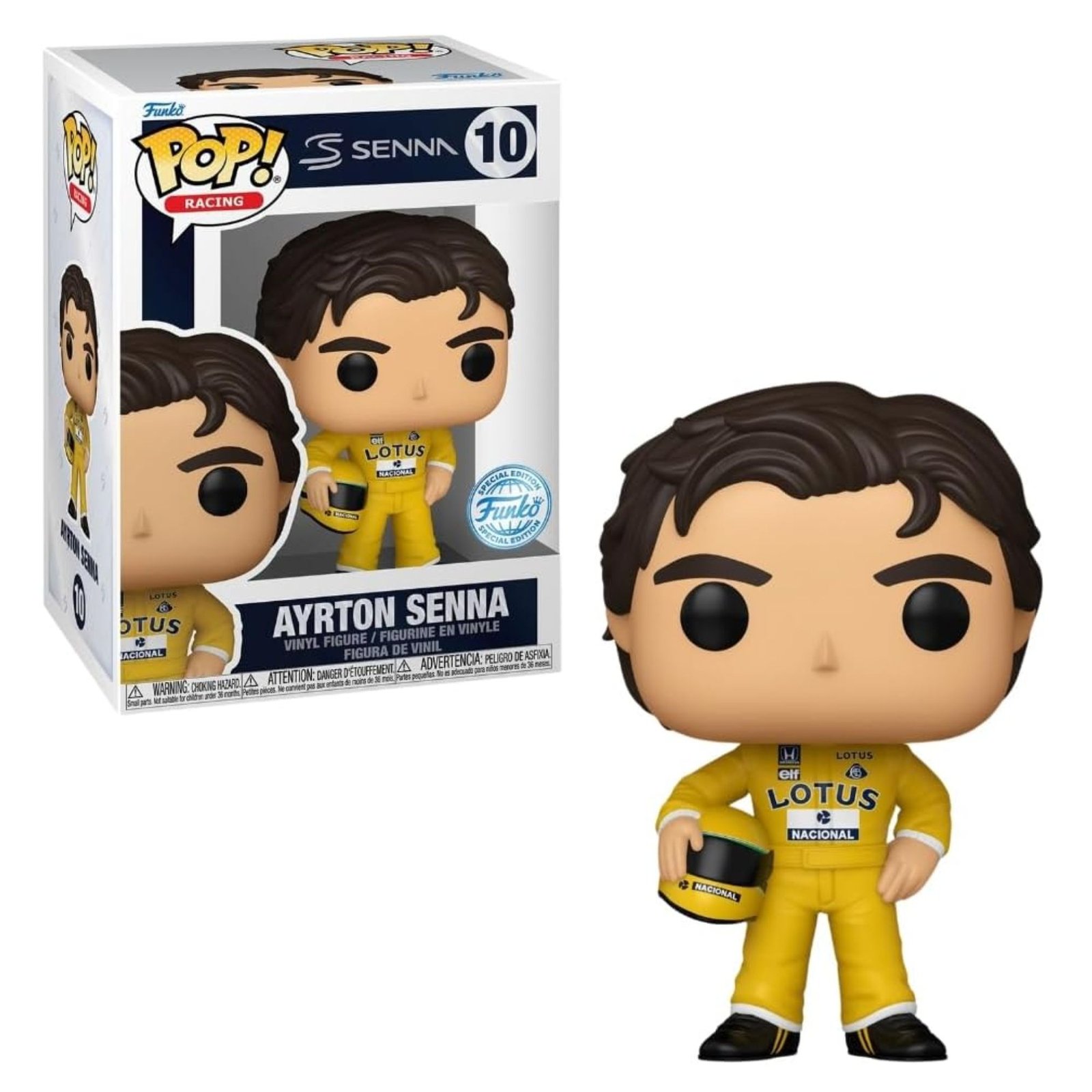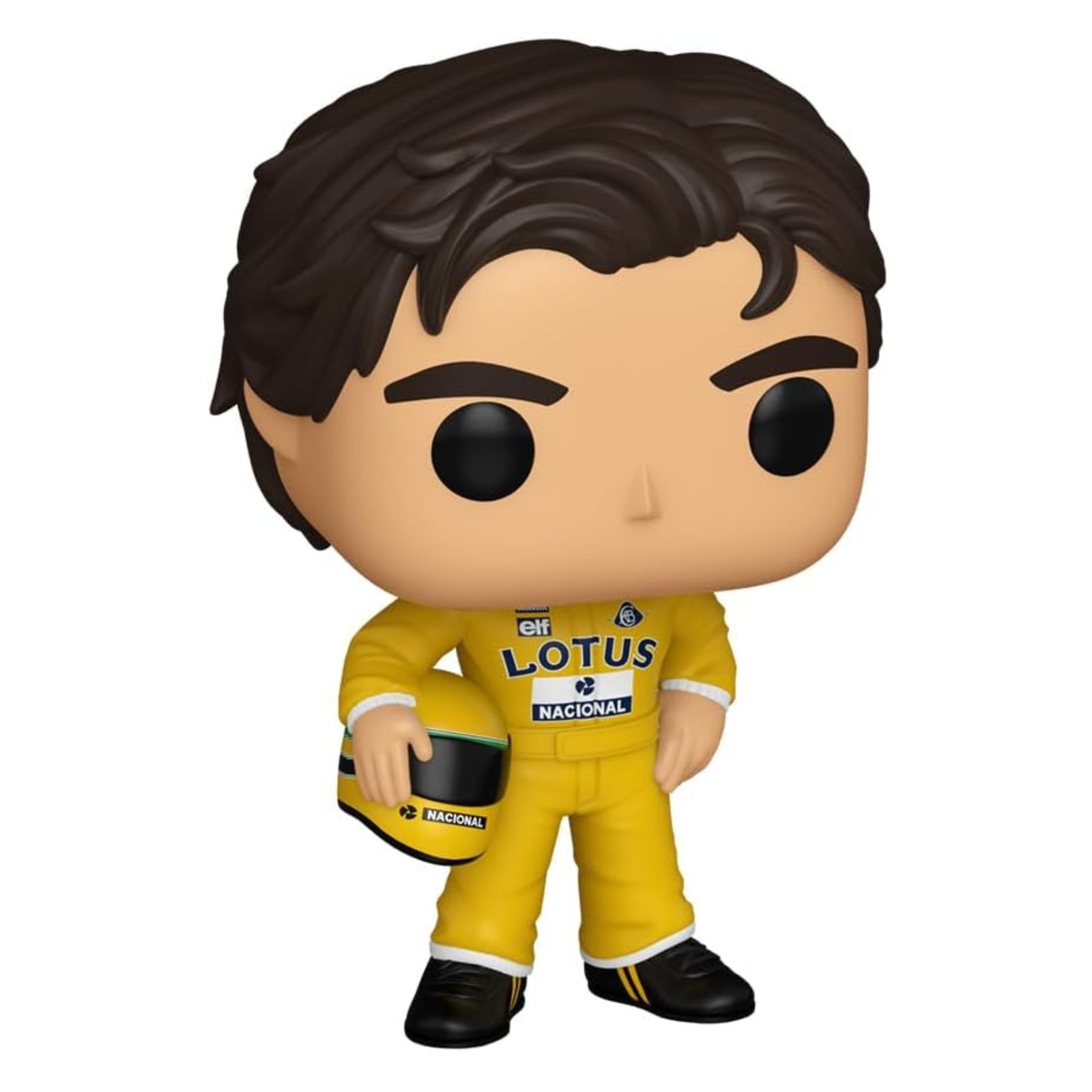UM ÍCONE DAS PISTAS. Com aproximadamente 10 cm de altura, este colecionável exclusivo retrata Ayrton Senna em seu clássico uniforme amarelo da Lotus, segurando o capacete, um símbolo de seus anos de glória na Fórmula 1.