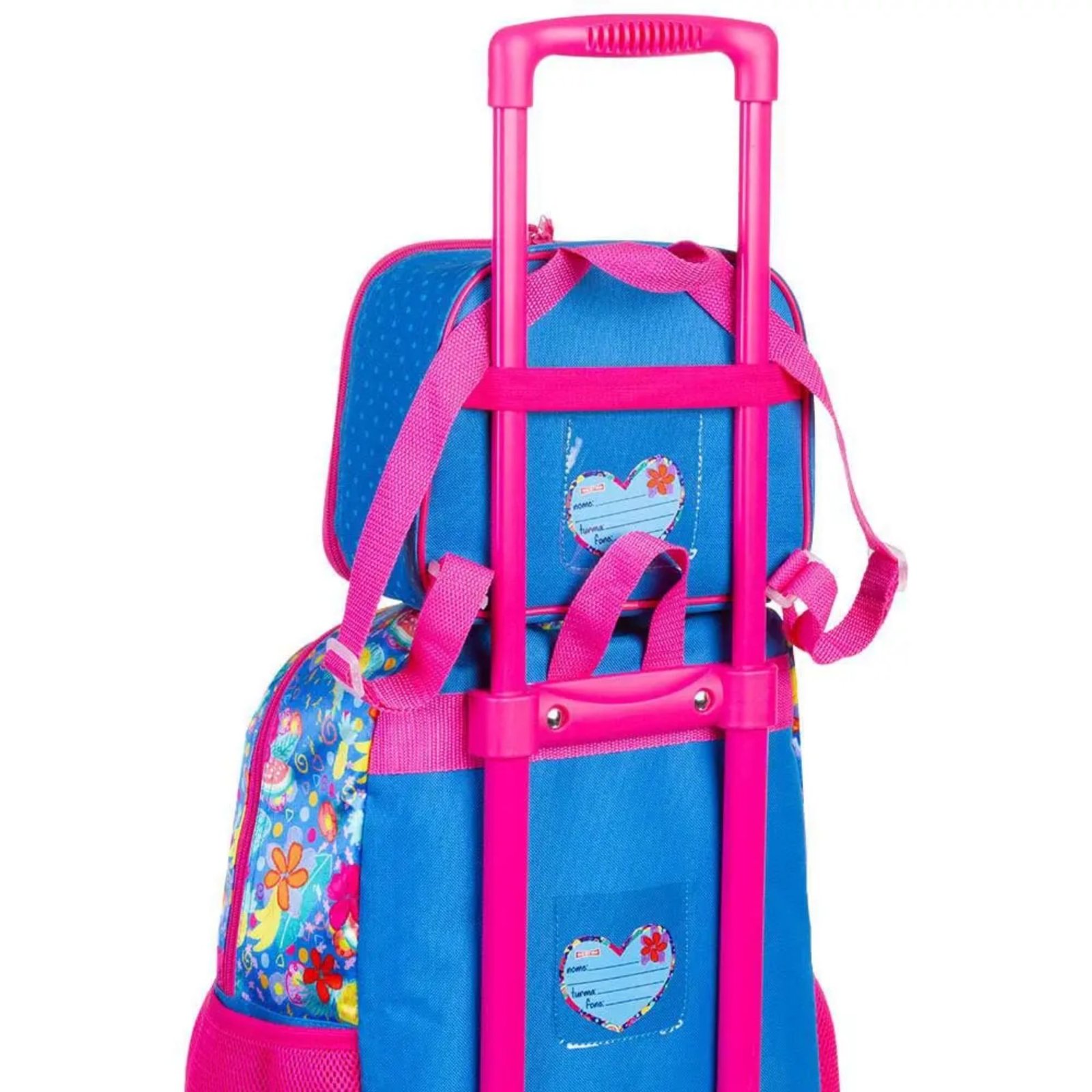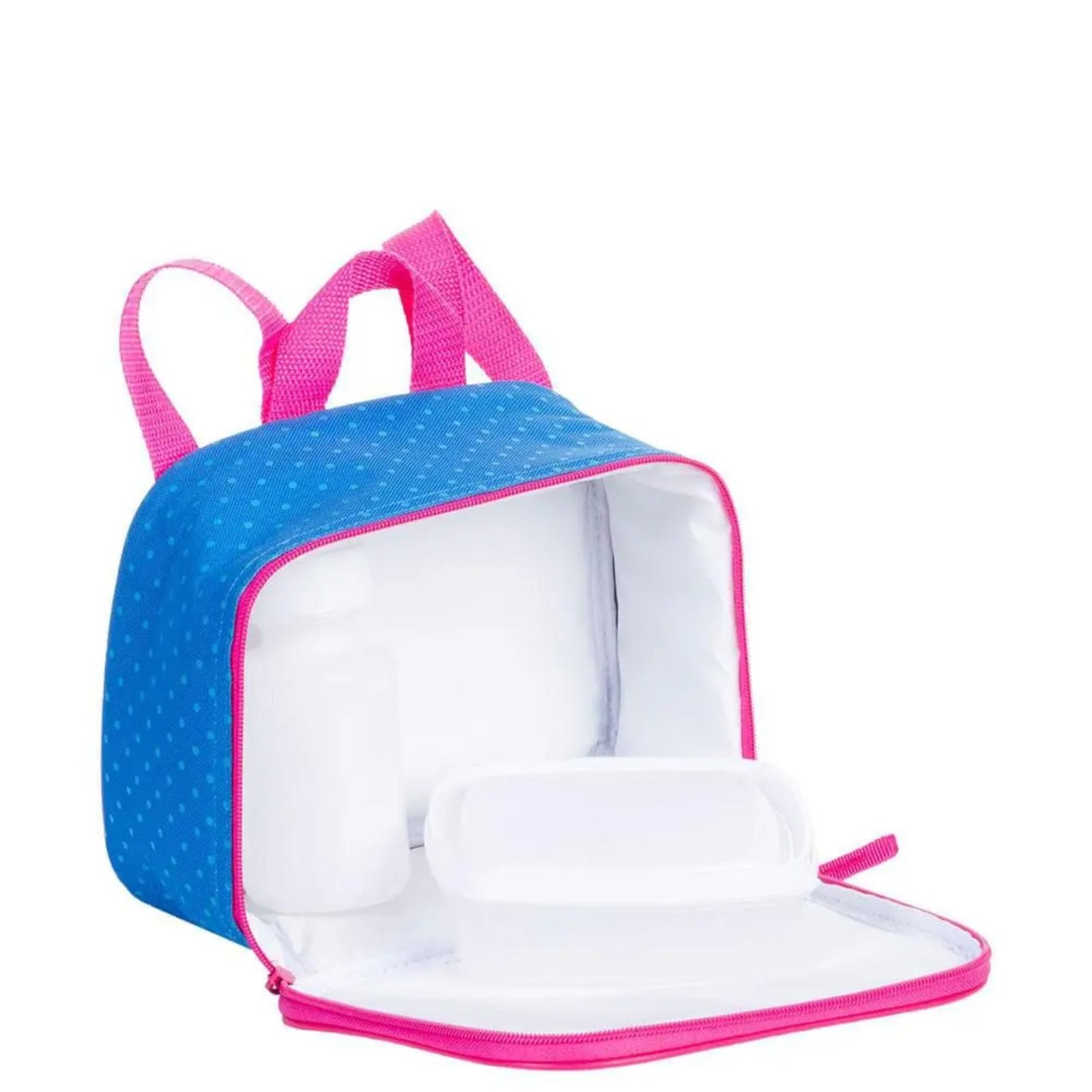 A estampa cheia de flores e frutas é bem tropical e ganha todo o painel frontal da lancheira. Este modelo possui três tipos de alças: de costas, com ajuste de altura; de mão; e carona, para acoplar no carrinho da mochilete ou na mala de viagem. O interior é revestido com tecido resistente a líquidos e fácil de limpar. O potinho plástico já vem junto, pra facilitar a organização do lanche