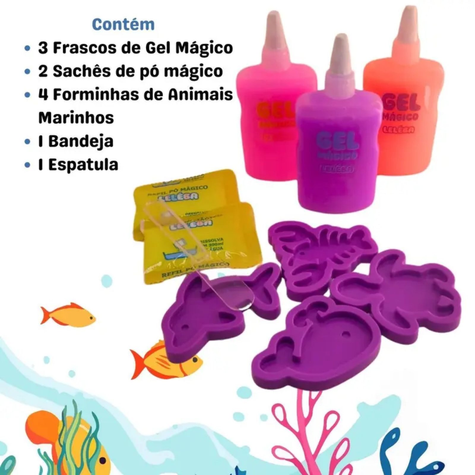 - 03 Frascos de Gel Mágico: Cores vibrantes Rosa, Violeta e Laranja.