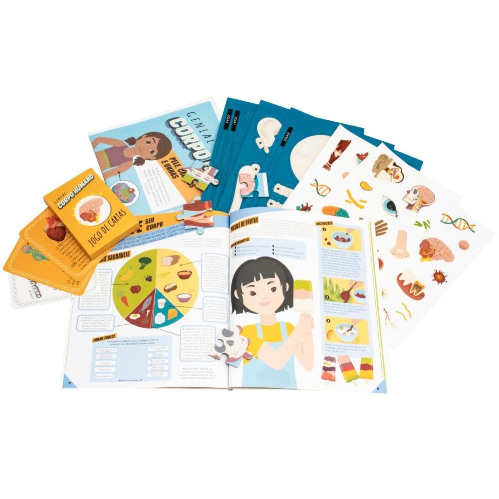 Quanto seu cabelo cresce em um dia? Qual a altura da pessoa mais alta do mundo? E o que aconteceria com seu corpo se você não tivesse ossos? Encontre as respostas para todas essas perguntas e muito mais dentro deste incrível BOX, repleto de atividades de aprendizagem! Há um livro cheio de fatos e jogos, duas folhas de adesivos, um quebra-cabeça incrível, um pôster, um jogo de cartas e um modelo 3D enorme para montar, completo com um belíssimo suporte de exposição.