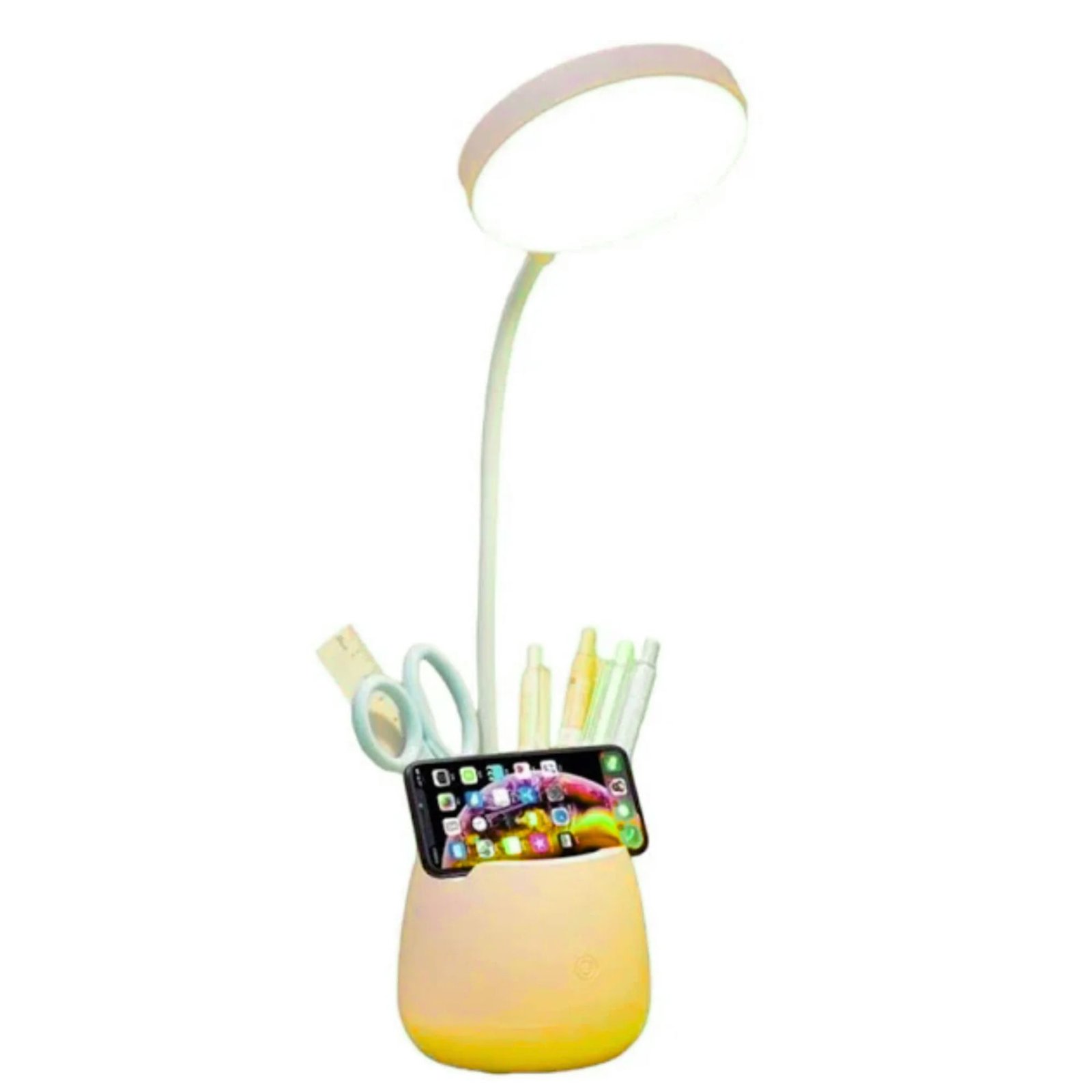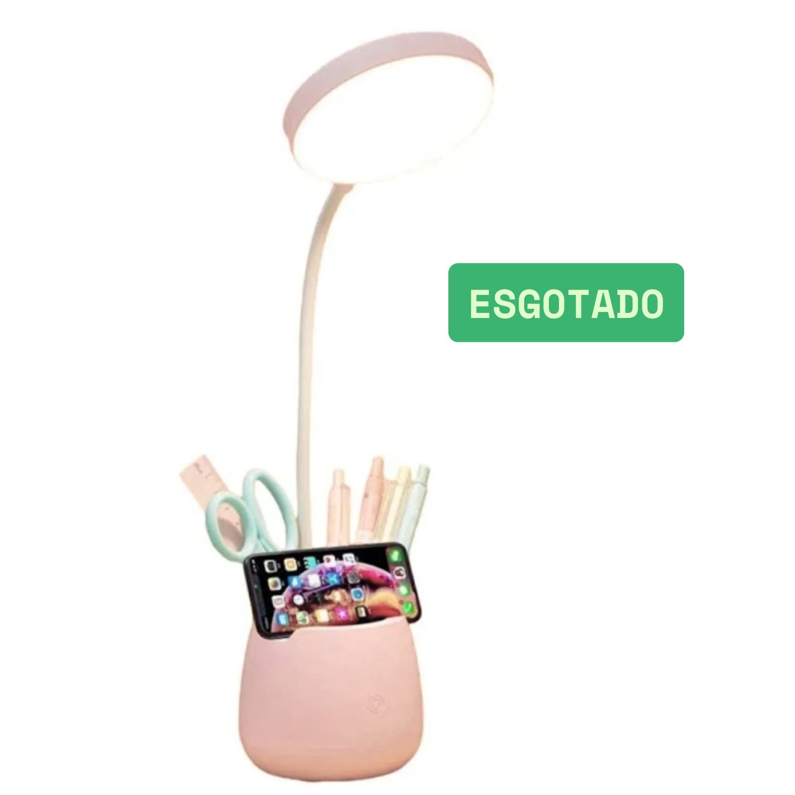 A haste flexível permite o ajuste do foco de luz, enquanto a base é útil para guardar canetas e outros acessórios, mantendo-os acessíveis durante o estudo ou trabalho. A base também serve como suporte de celular, facilitando o acompanhamento de aulas online ou realização de videochamadas.