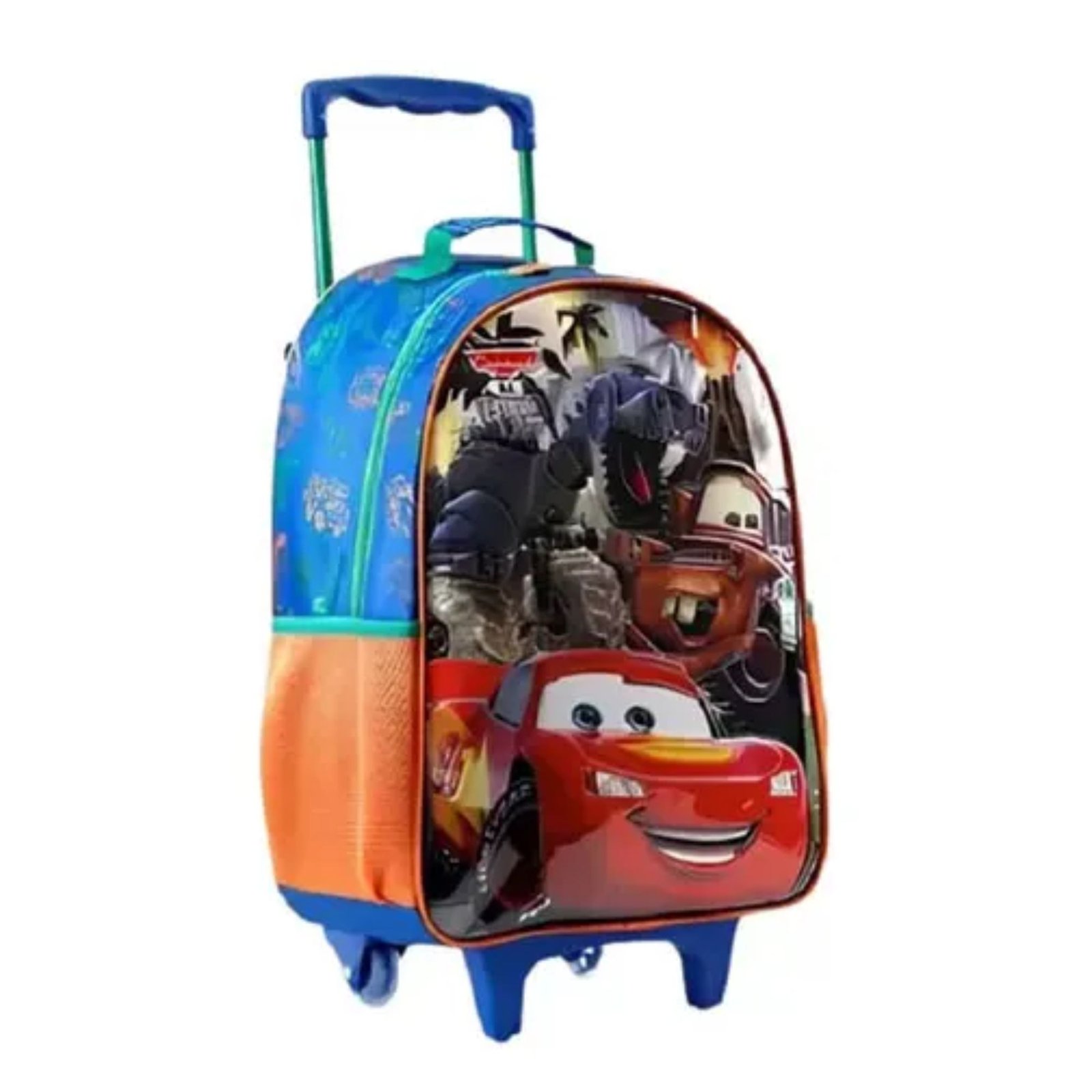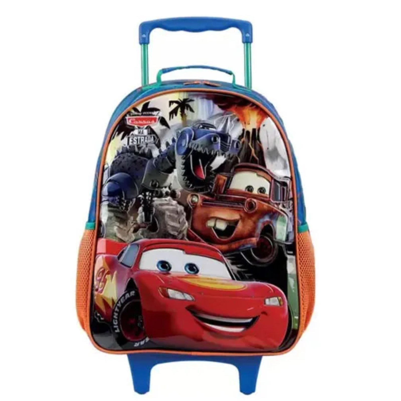 A mochila apresenta um compartimento principal amplo, 2 bolsos laterais em mesh, zíperes com puxadores personalizados para fácil acesso, uma alça de mão feita de nylon com poliéster e piping forrado para maior conforto. O carrinho é feito de metal e possui travas, tornando-a uma opção prática e durável para transportar materiais escolares ou outros itens com estilo inspirado no filme Carros da Disney.