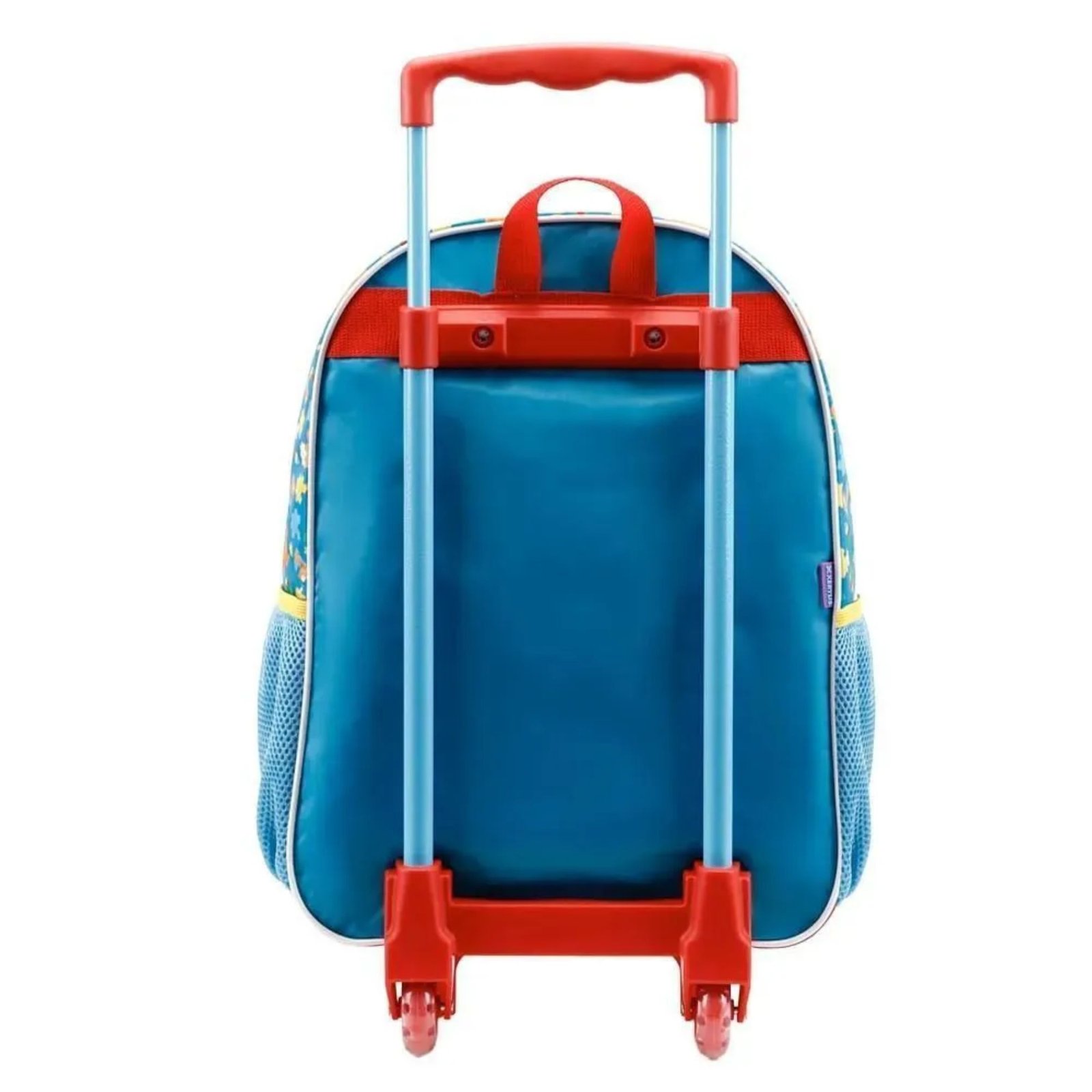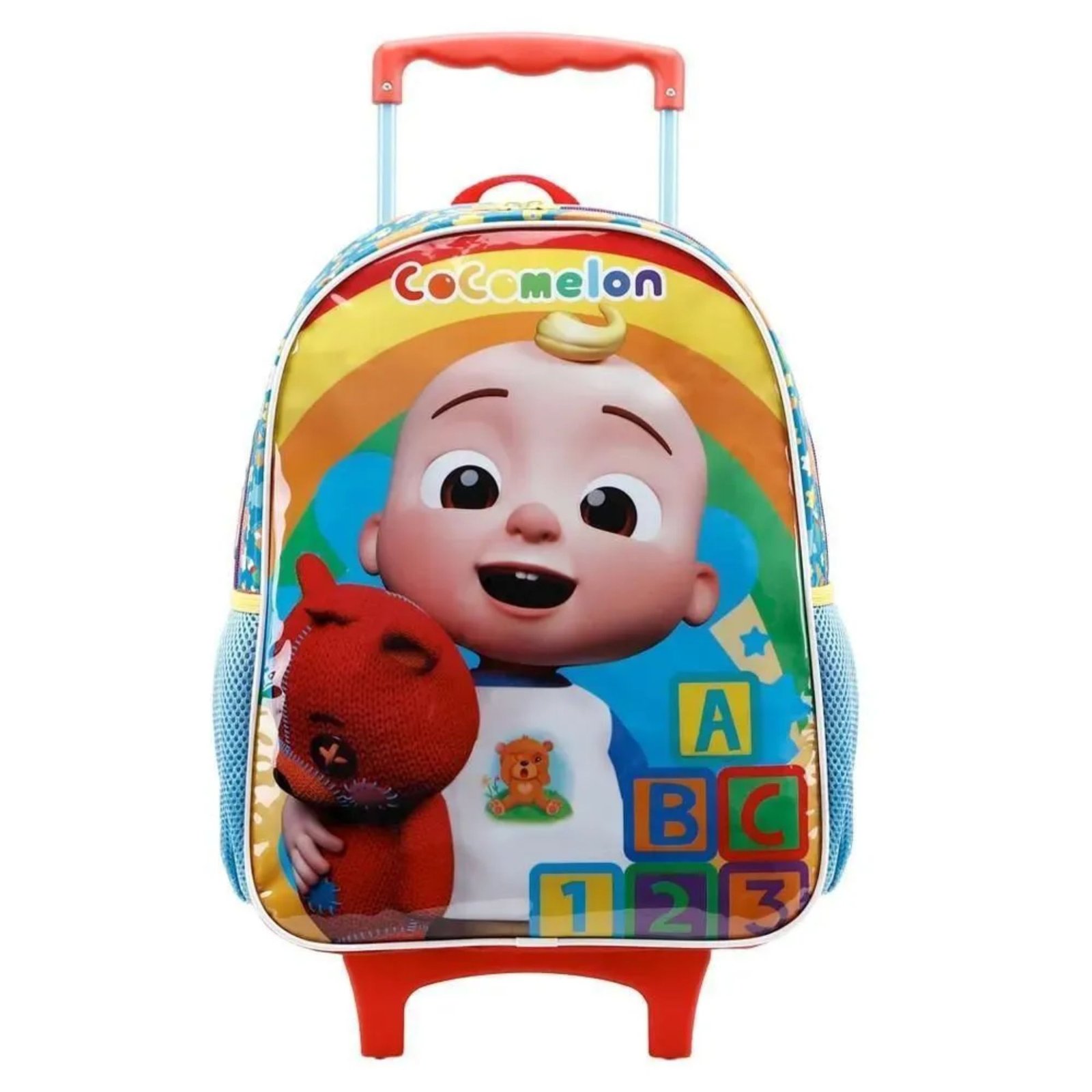 Mochila com Rodas 16 Cocomelon X – 11900 – Em tamanho 16″, produzida em poliéster estampado, material resistente e de fácil limpeza. Possui painel frontal PVC Cristal. Compartimento principal amplo, 2 bolsos laterais mesh, fechamento por zíper com puxadores simples, alça de mão em nylon. Carrinho em metal com travas. Medidas aproximadas (AxLxP) em cm: 40x30x15