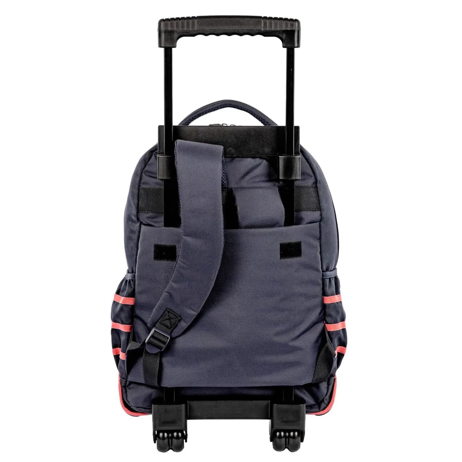 Possui um bolso frontal com fecho de zíper, ideal para guardar objetos de fácil acesso, e dois bolsos laterais em redinha, perfeitos para carregar garrafas de água ou pequenos itens.A versão com carrinho se destaca pelas suas duas rodinhas, que facilitam o deslocamento, e pelos pés de apoio e revestimento na base, que ajudam a proteger o tecido e tornam o produto mais resistente a impactos durante o transporte.