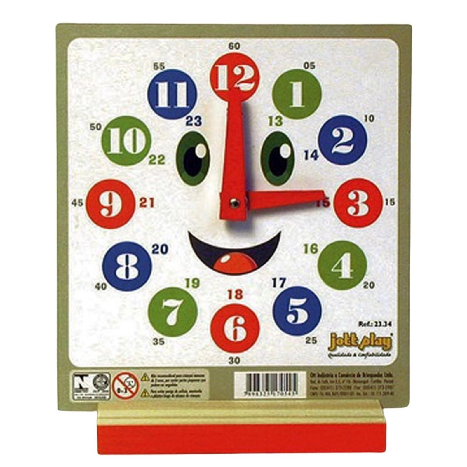Números impressos coloridos, ponteiros, mostrador com cara de palhacinho.