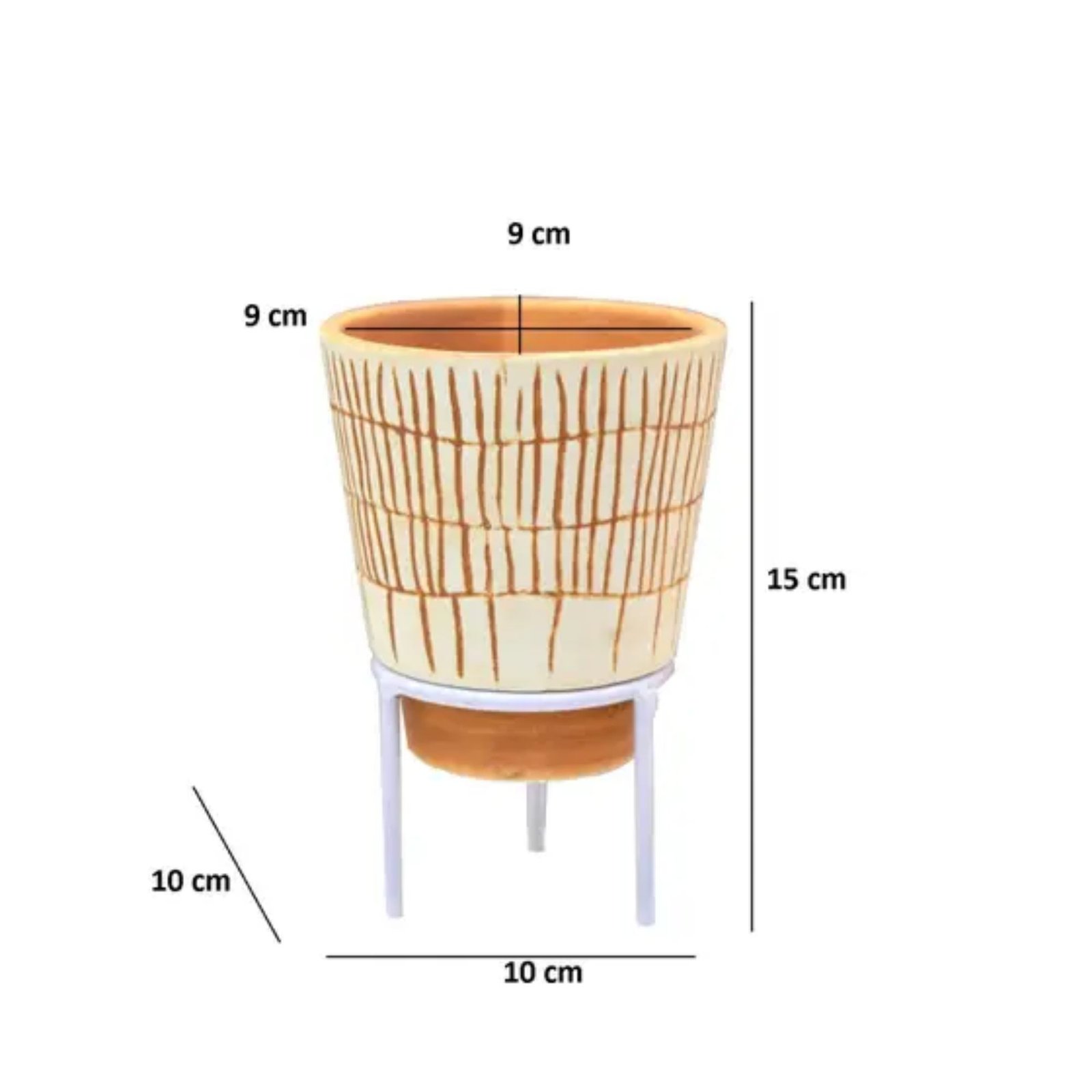 Tamanho Cachepot : 15cm (Altura) x 10cm (Largura) x 10cm (Profundidade) – Boca: 9cm Tamanho Suporte: 6,5cm (Altura) x 7,5cm (Diametro)